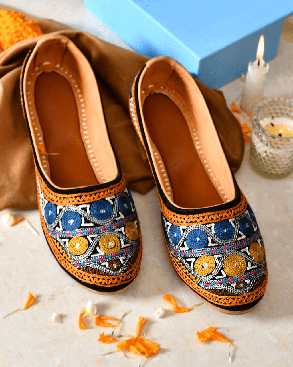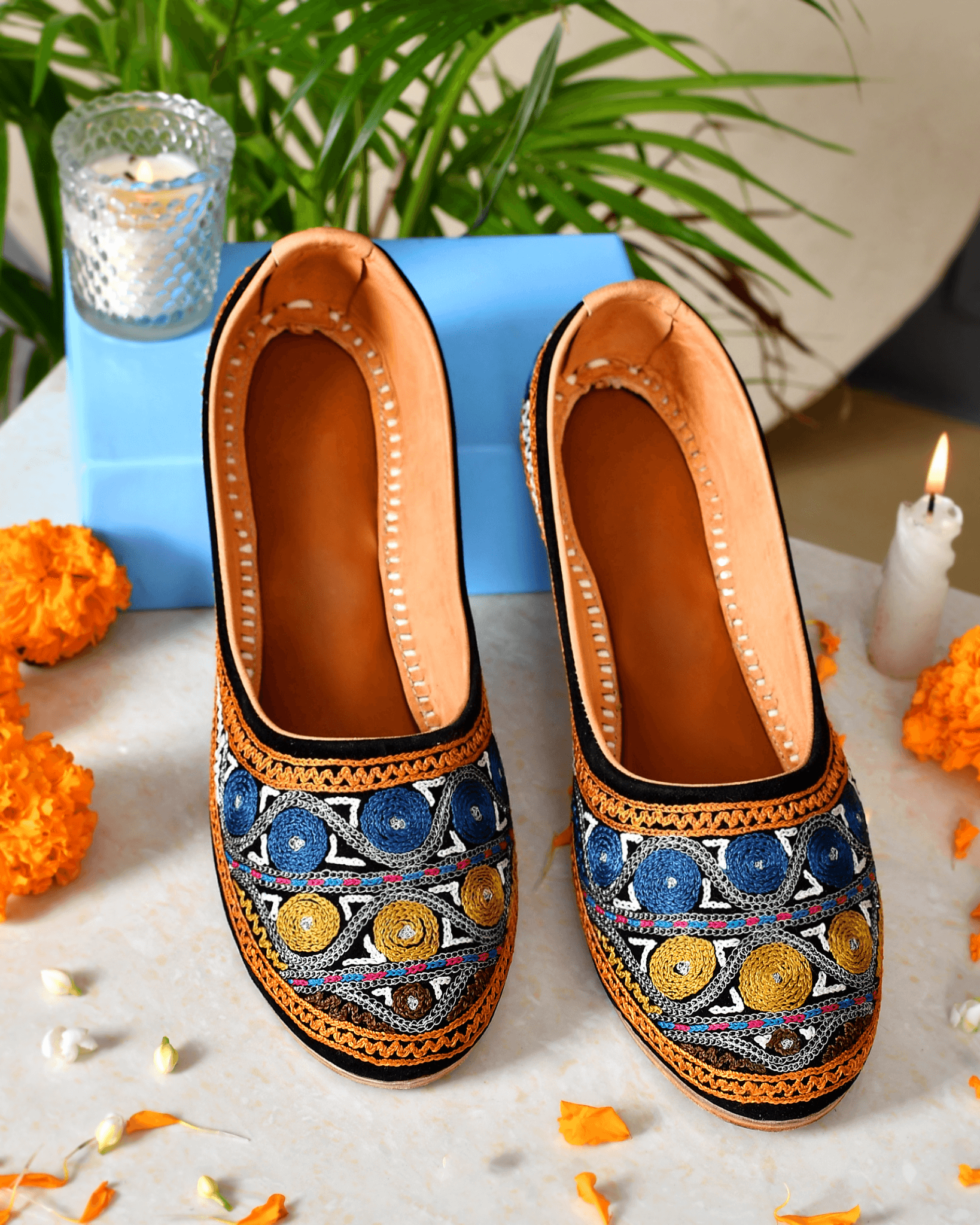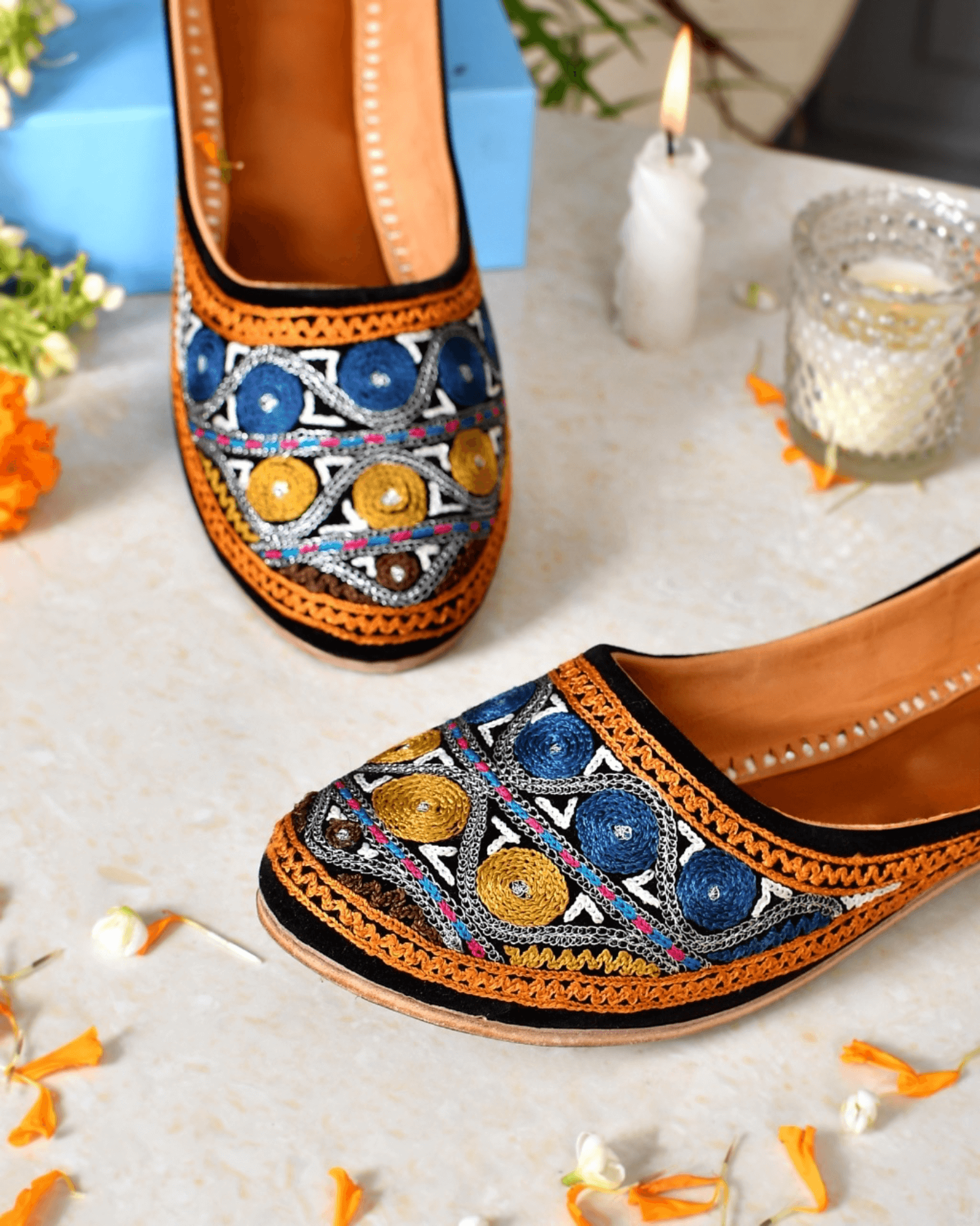 Discover the exquisite packaging of Jutticrafts' juttis. Each pair comes beautifully presented in a hardcover box, ensuring safekeeping and adding an elegant touch. The accompanying dust bag protects your juttis from dust and scratches, while the greeting card allows for a personalized touch. Wrapped in butterpaper, your juttis arrive in pristine condition, ready to be worn with joy.