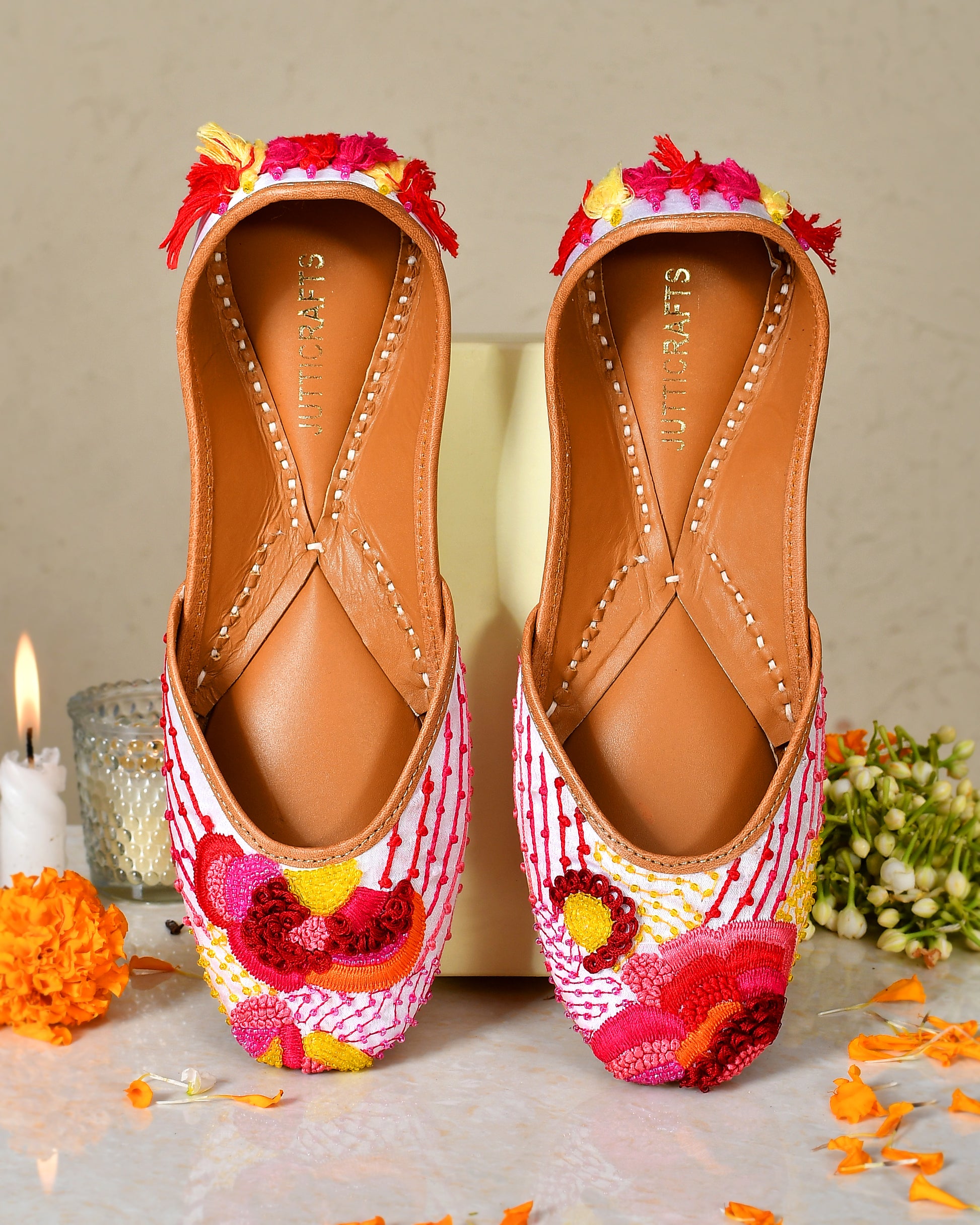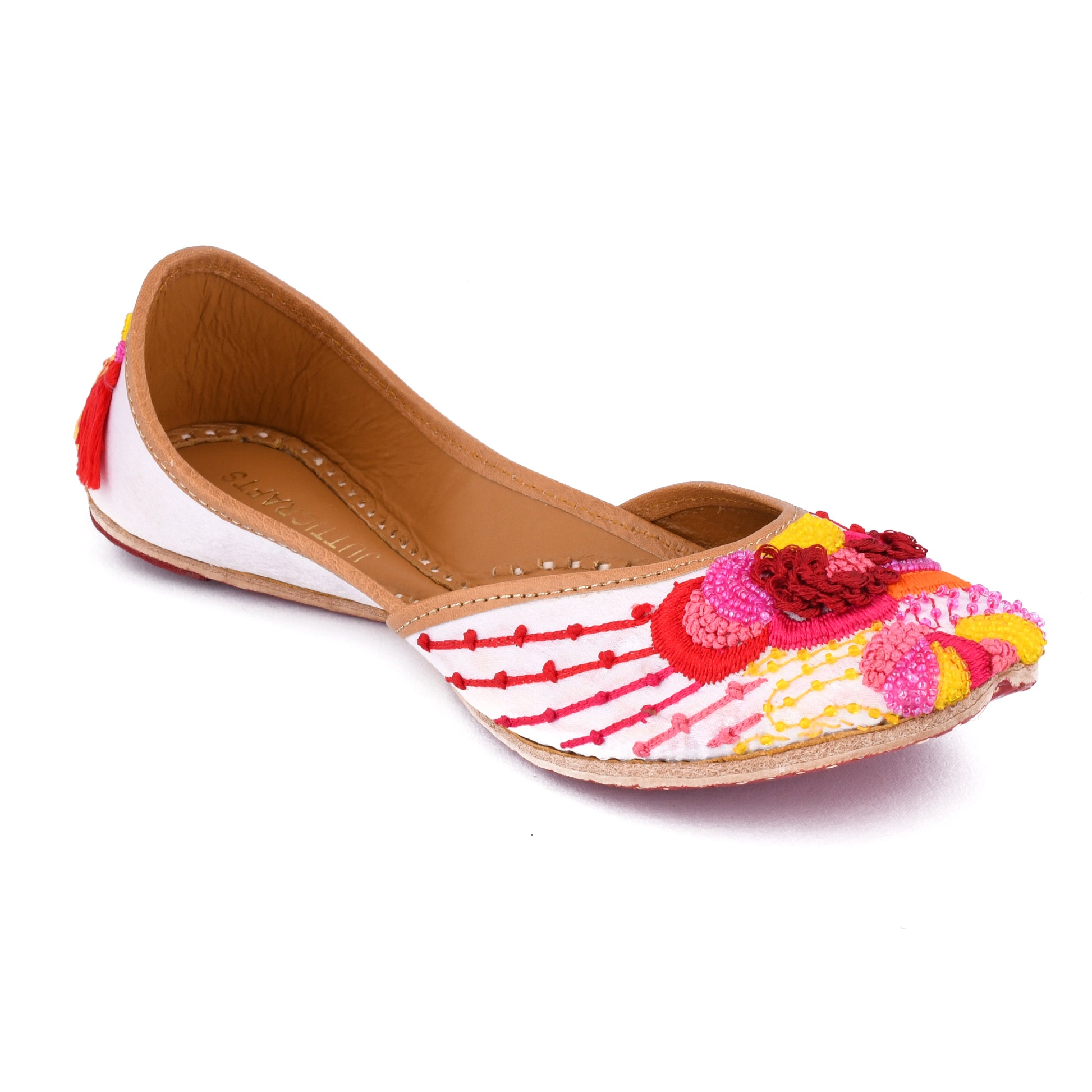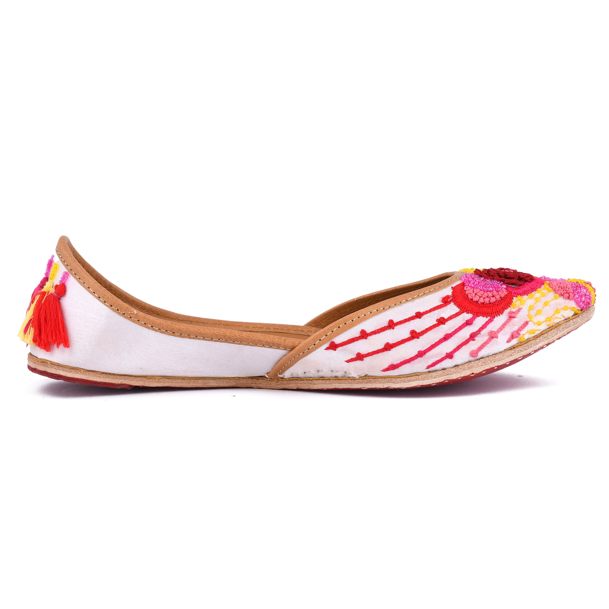 Introducing our stunning white silk cloth women's jutti, a masterpiece of handmade craftsmanship. These juttis boast a captivating golden color that exudes elegance without any shoe biting discomfort.