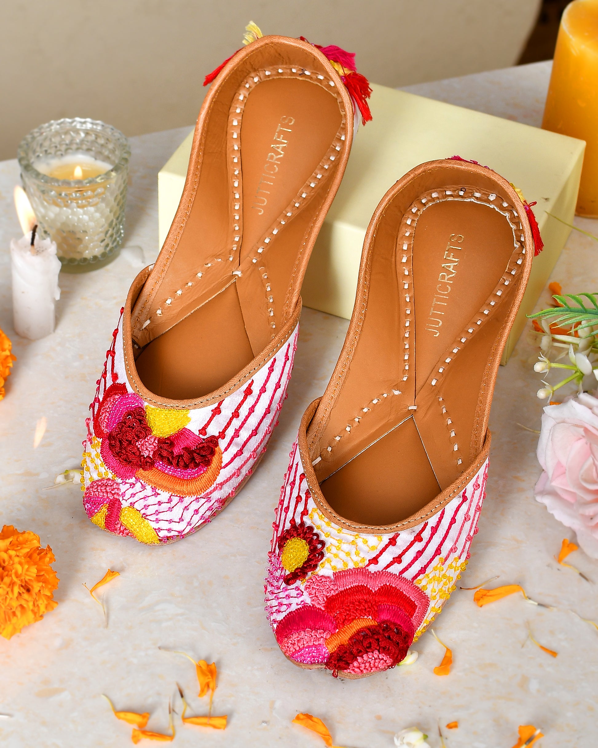 Discover the exquisite packaging of Jutticrafts' juttis. Each pair comes beautifully presented in a hardcover box, ensuring safekeeping and adding an elegant touch. The accompanying dust bag protects your juttis from dust and scratches, while the greeting card allows for a personalized touch. Wrapped in butterpaper, your juttis arrive in pristine condition, ready to be worn with joy.